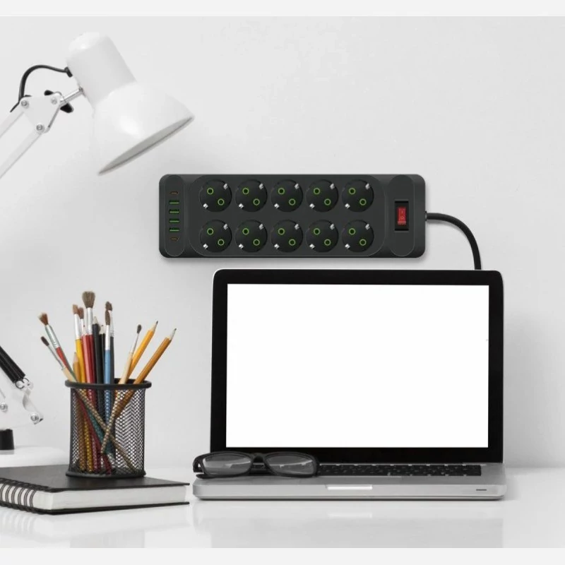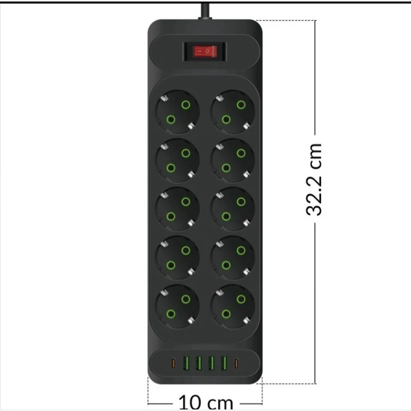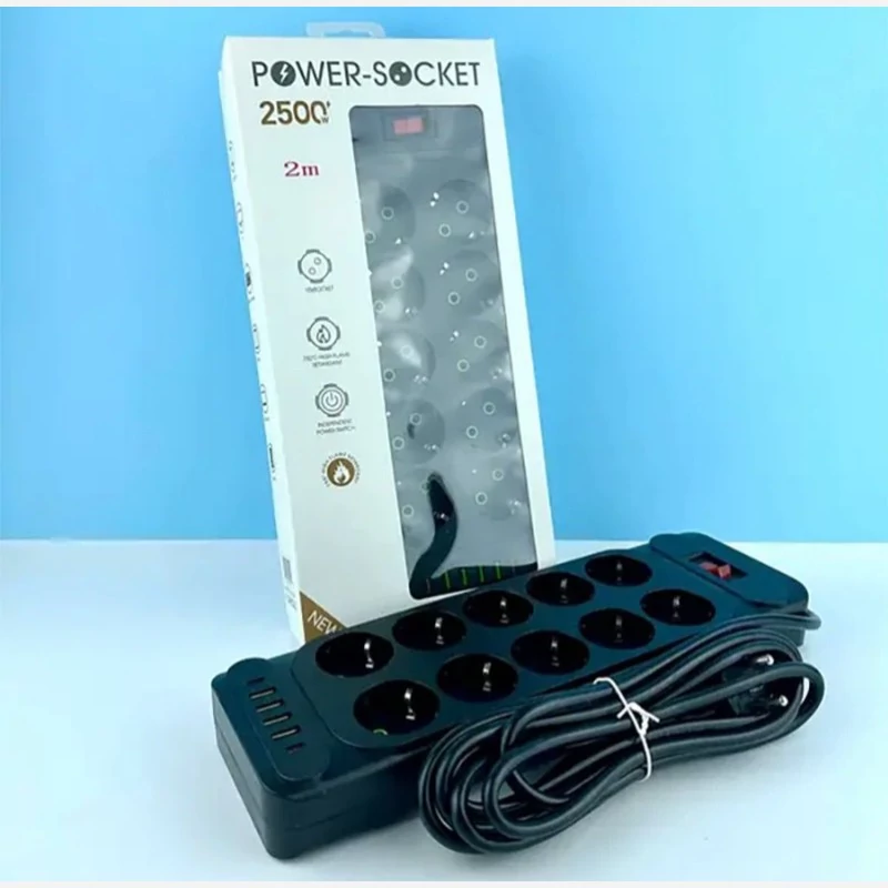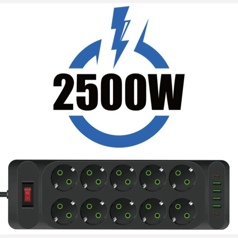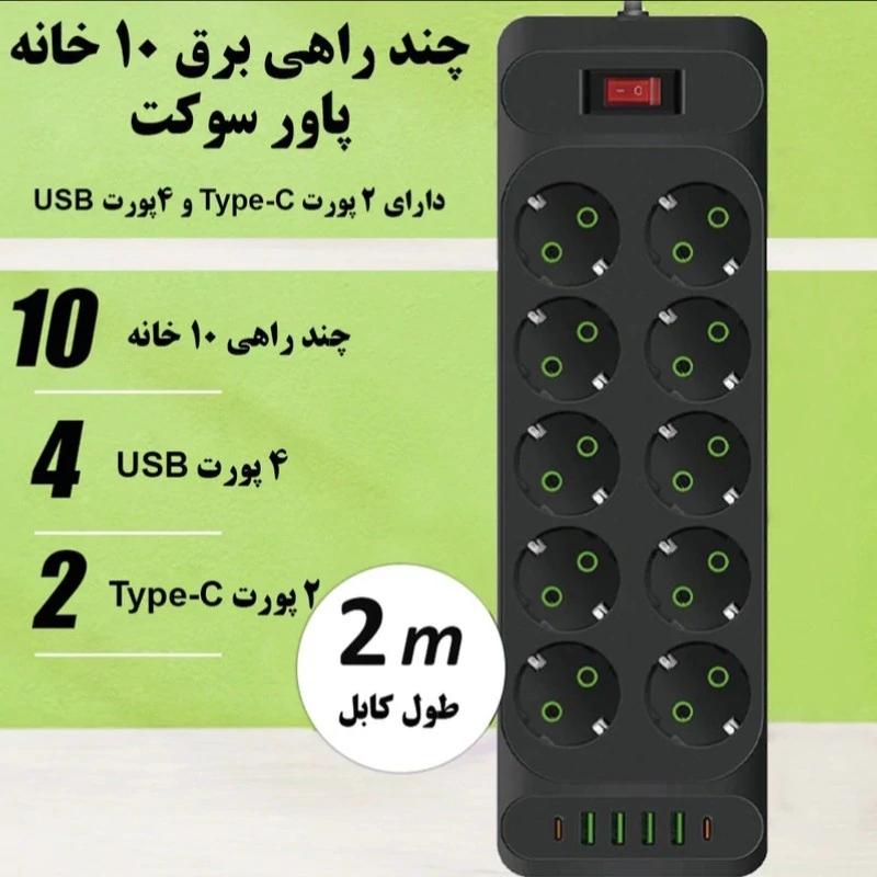 چند راهی برق پاور سوکت مدل F35U دارای 10 خانه محل اتصال دوشاخه برق است. طول کابل آن 2 متر است و از متریال ساخت بسیار بالا و با کیفیت برخوردار است. نکته قابل توجه ، پورت های USB و Type-C قرار گرفته روی این چند راهی برق حرفه ای است. این چند راهی با دارا بودن 4 پورت USB و 2پورت Type-C می تواند ما را از هرگونه شارژر یا .. بی نیاز کند. توان خروجی این چند راهی 10 آمپر و حداکثر 2500 وات می باشد