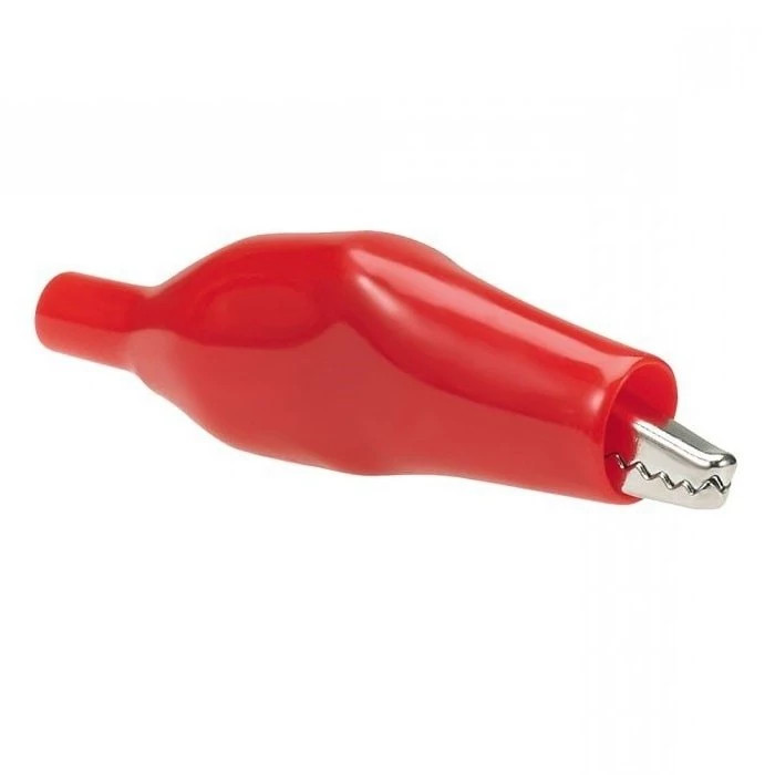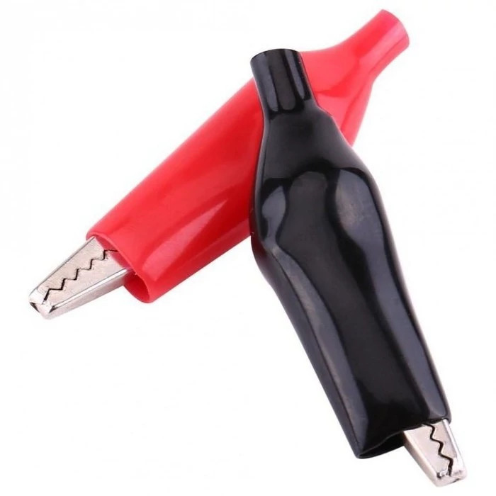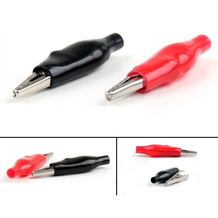 گیره سوسماری متوسط 50 میلی متری تکی، دارای دو رنگ قرمز و مشکی، روکش پلاستیکی عایق به رنگهای قرمز و مشکی جهت قطب مثبت + و منفی -، فاصله حداکثری دهانه 13mm