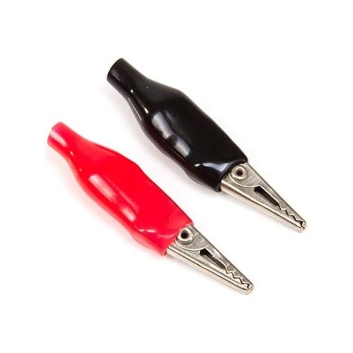 گیره سوسماری متوسط 50 میلی متری تکی، دارای دو رنگ قرمز و مشکی، روکش پلاستیکی عایق به رنگهای قرمز و مشکی جهت قطب مثبت + و منفی -، فاصله حداکثری دهانه 13mm